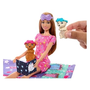 A Barbie está pronta para dar uma festa do pijama com cachorrinhos! Este conjunto inclui uma boneca Barbie, dois cachorrinhos adoráveis, um saco de dormir que serve para os três e 10 acessórios. Para uma diversão com mudança de cor, as crianças podem transformar o rosto do cachorrinho de limpo para macio usando água gelada e morna. Pronta para uma noite divertida em casa, a boneca Barbie veste um camisão e pantufas. Todos têm uma máscara de dormir para sonhos tranquilos! A boneca não fica em pé sozinha. As cores e decorações podem variar.