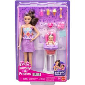 Playset Barbie Skipper Babás, Inc. com boneca morena, boneca bebê morena, cadeirinha alta e 8 acessórios, incluindo comida.