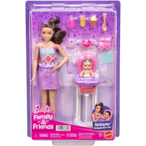 - A boneca Skipper está com as mãos cheias — pequenos cuidadores podem ajudar a cuidar do bebê com os playsets Barbie Skipper Babás Inc., inspirados em momentos clássicos, como a hora da alimentação!