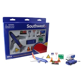 Conjunto de brinquedos Daron Southwest Airlines Airport com metal fundido sob pressão Modelo de avião com peças de plástico, carros e brinquedos de transporte para crianças de 3 anos ou mais - Conjunto de brinquedos realista para companhias aéreas: o conjunto de brinquedos de aeroporto oficialmente licenciado pela Southwest Airlines oferece uma experiência de jogo realista com designs e marcações autênticos - Brinquedos de aeroporto: perfeito para inspirar brincadeiras de fingir e despertar o amor pela aviação, este conjunto permite que as crianças explorem o mundo dos aeroportos com detalhes realistas - O que está incluído: 1 modelo de brinquedo de avião, 2 veículos de brinquedo, 2 cones de construção e 5 de tráfego sinais - Materiais de qualidade: avião de metal fundido com peças de plástico; o avião de brinquedo mede aproximadamente 5,75 polegadas de comprimento com uma envergadura de 5 polegadas - Deixe sua imaginação voar: os aviões Daron trazem sorrisos para crianças e colecionadores desde 1990 como fonte americana de itens colecionáveis e brinquedos temáticos de transporte relacionados à aviação - Metal fundido - Licenciado oficialmente - É um ótimo presente ou lembrança