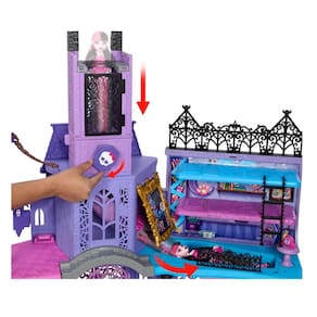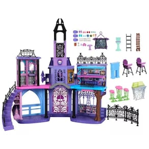 Monstros e mistérios aguardam no conjunto de brinquedo Monster High Escola do Terror! Essa casa de bonecas assustadora apresenta brincadeiras em 360 graus, várias surpresas e mais de 35 peças que contam histórias para aventuras de arrepiar os ossos. Hora de descobrir os encantos arrepiantes de Monster High em mais de 7 áreas de recreação, incluindo uma cafeteria dos sustos, uma sala de aula, um banheiro e um quarto que acomoda até 3 bonecas.(Vendidas separadamente) As surpresas o aguardam! É possível girar a escada para revelar a sala de poções escondida e, em seguida, você pode encontrar as duas passagens escondidas para transformações secretas de escorregadores e alçapões. Uma das passagens secretas tem um escorregador! Basta colocar uma boneca na torre e girar o botão para que ela deslize até um beliche no dormitório. Atrasado para a aula de mordidologia? Apertar o despertador ao lado da cama joga uma boneca na classe do primeiro andar abaixo, no estilo alçapão! Depois da aula, é possível girar o lustre e o pódio transforma a entrada em uma festa na discoteca!