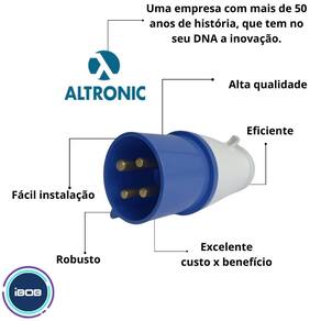 A ibobvendas online tem a missão de garantir a satisfação total do seu cliente, tanto nos produtos quanto no atendimento, estabelecendo assim uma relação de confiança plugue 3p + t 32a 220/250v azul 9h ip44 Quer plugues robustos e resistentes que garantem máxima segurança na sua instalação Então você precisa do nosso plugue 3p + t 32a 220/250v azul da altronic. Os plugues industriais oferecem praticidade, flexibilidade e segurança, nas conexões elétricas temporárias que requerem elevadas correntes elétricas. A nossa linha de plugues da altronic conta com uma gama completa de produtos que atendem os mais diversos ambientes e aplicações, tanto para a indústria quanto para instalações comerciais. Características gerais: - marca: altronic; - cor do produto: azul; - altura: 17,0cm; - largura: 7,00cm; - profundidade: 7,0cm; - pinos: 4 pinos 3p + t ; - corrente nominal: 32a; - tensão nominal: 220/250v; - posição de contato terra: 9h; - grau de proteção: ip44; - construção de acordo com a norma iec 60309-2; - para redes de 50/60hz. : Tenha tranquilidade de comprar com quem está disposto a te oferecer o melhor atendimento. Caso precise de ajuda após a compra, conte com o nosso time de especialistas para lhe auxiliar. Estamos sempre à disposição para tirar qualquer dúvida. Marca: Não Informado Ean: 7894795045529