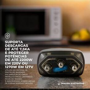Potência suportada protege até 2200W em 220V ou 1270W em 127V.