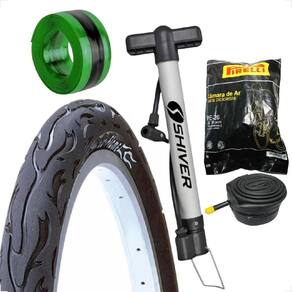 Itens inclusos: 1 unidade Pneu kenda Flame aro 26x2.125 1 unidade Camara de ar aro 26 Pirelli Bico grosso 33mm 1 unidade mini bomba de ar Shiver aluminio 30cm 1 unidade fita anti furo tectire