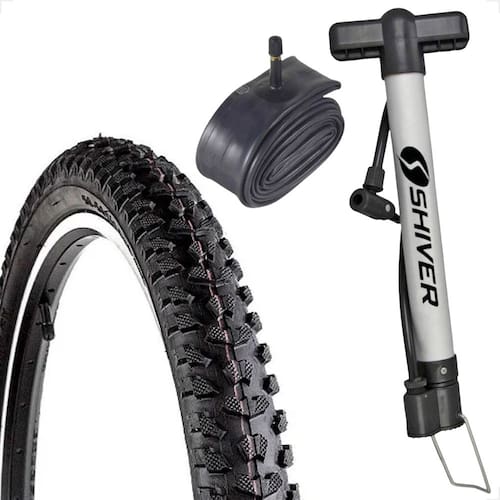 ITENS INCLUSOS: 1 Unidade pneu Levorin Excess Ex 26x1.95 cravudo 1 Unidade carama de ar Shiver aro 26 33mm bico grosso 1 Unidade bomba de ar manual Shiver 30cm