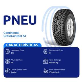 Seja no dia a dia urbano ou nas escapadas para terrenos mais exigentes, o Pneu Continental CrossContact AT 215/65 R16 entrega desempenho equilibrado e confiável. Ideal para quem busca tração em diversos tipos de solo sem abrir mão do conforto e da segurança no asfalto. Confira mais detalhes: