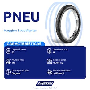 Tenha um excelente desempenho dentro da cidade com o Maggion Streetfighter! Ele além de ser um pneu de alta resistência ainda vai proporcionar ao usuário todo conforto que um pneu pode oferecer em uma viagem seja para o trabalho ou para um dia de passeio. Confira mais detalhes: O Streetfighter é um pneu com uma excelente versatilidade, se encaixa em diferentes tipos de motocicletas por ter um desenho e tamanho padrão, basta saber as medidas do aro de sua moto. Sua construção diagonal além de garantir uma maior estabilidade a motocicleta, ele também proporciona uma super resistência na sua lateral por ser um pneu mais rígido comparado aos demais.