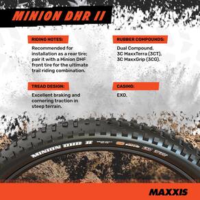 - MAXXIS MINION DHR II: Com botões laterais emprestados do lendário Minion DHF, mas alargados para fornecer mais suporte, o Minion DHR II oferece excelente tração nas curvas e frenagem.