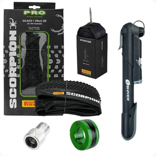 ITENS INCLUSOS: 1 UNIDADE PNEU PIRELLI SCORPION ARO 29X2.20 KEVLAR 1 UNIDADE CAMARA DE AR ARO 29 VALVULA PRESTA 48MM SPORTUBE 1 UNIDADE BICO ADAPTADOR VALVULA PRESTA BICO FINO PARA GROSSO 1 UNIDADE FITA ANTI FURO TECTIRE 1 UNIDADE MINI BOMBA SHIVER COM MANÓMETRO