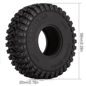 Observação: O tamanho pode ter uma diferença de 1 a 2 mm devido à medição manual. Especificações: Material: borracha Quantidade: 4 peças Peso: 11g/peça (11 g/peças) Diâmetro externo: 58 mm Largura: 20 mm / 0,79 pol. Adequado para: 1/24 RC Crawler Car Axial SCX24 C10 Fechadura JLU Gladiator Bronco Conteúdo da embalagem: 4 pneus de carro RC de 2,54 cm (1") - ?Alta simulação? Pneus com design exclusivo que se encaixam na maioria dos aros de roda 1.0. - ?Pneu de borracha macia?Fornece bom suporte, adequado para todos os tipos de terreno, para atender à experiência operacional dos ventiladores de controle remoto. - ?Aderência incrível?Padrões irregulares podem proporcionar excelente aderência, aumentar o atrito entre o pneu e o solo e garantir a estabilidade do manuseio. - ?Nova tecnologia?Moldado com um novo composto S5 super pegajoso, não deforma facilmente e aumenta a resistência ao desgaste durável. - ?Vários modelos?Serve em 1/18 TRX4M 1/24 RC Crawler Car Axial SCX24 C10 Deadbolt JLU Gladiator Bronco ou outro micro carro.
