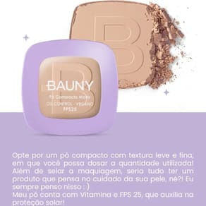 Pó Compacto Bauny Cor 060 Caso a sua pele seja extremamente oleosa, você pode aderir ao pó compacto da Bauny para segurar a maquiagem por mais tempo. O pó compacto da Bauny possui sílica de arroz, que Marca: Bauny