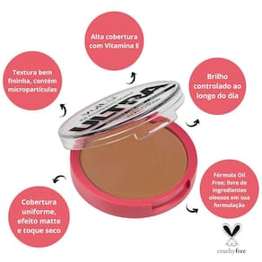 -cobertura média a alta. -efeito natural. -fórmula Oil Free: livre de ingredientes oleosos em sua formulação. -com Vitamina E. -aumenta a durabilidade da maquiagem. -vegano. -livre de parabenos. -brilho controlado ao longo do dia. -dermatologicamente testado.