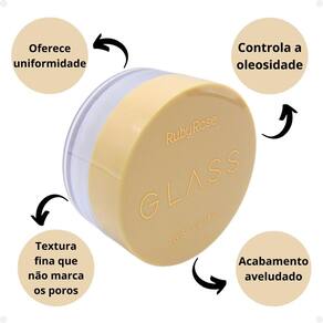 O Pó Solto Glass é um produto de alta qualidade que oferece uniformidade e controle de oleosidade. Sua textura é fina, e o acabamento é aveludado, não marca os poros, deixando a pele matte natural. Não testado em animais. Produto vegano. 100% livre de parabenos e sulfatos.