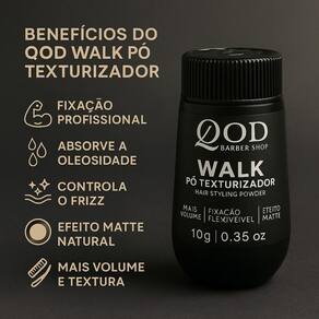 O pó texturizador walk da qod barbershop garante excelente fixação e acabamento profissional, ideal para quem busca volume e controle do frizz sem pesar nos fios. Sua fórmula absorve a oleosidade da raiz, proporcionando textura seca, efeito matte e estrutura duradoura para o penteado.