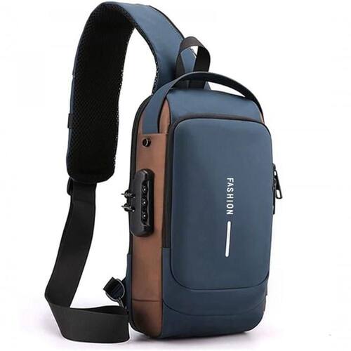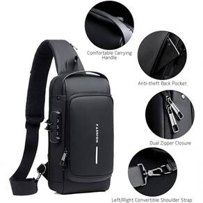 Esta é uma descrição de uma mochila de ombro masculina que possui uma trava à prova d'água antirroubo e um porta de carregamento USB. A mochila é projetada para ser usada como uma bolsa tiracolo, permitindo que o usuário carregue seus pertences de forma segura e conveniente.