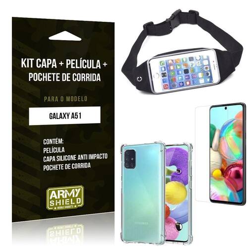 Kit Pochete Galaxy A51 Pochete + Capinha Anti Impacto + Película de Vidro - ArmyshieldKit Pochete para Corrida + Capa Silicone Anti Impacto + Película de Vidro Blindada Armyshield A capa de silicone anti impacto protege contra eventuais quedas, arranhões além de dar uma sensação de segurança na pegada do seu celular. Sendo 100% transparente mantem a originalidade e a beleza natural do seu aparelho. Além de possuir cantos reforçados que evitam ainda mais os fortes impactos causados por quedas. A Película de Vidro Blindada - Armyshield, traz o que há de mais moderno quando se trata de proteção de telas, com uma espessura de 0,33mm garante total proteção contra riscos e quedas e trincos. Pochete para celular, e porta objetos. Feita em elastano e tpu, use todas as funções do seu aparelho.Parte frontal sensível ao toque para operar normalmente seu celular.Material impermeável para manter sempre seu celular e objetos secos.Ideal para esportes, corrida, bike, levando seu celular e objetos sempre protegidos. Pode ser usada de ambos os lados, com o touch virado para frente, ou lado com a fita refletiva virada para a frente.Tamanho universal, compatível com qualquer aparelho menor que 6.3 Com regulagem de tamanho da cintura. A prova de chuva e suor. Ultra leve ITENS INCLUSOS - 1 Pochete de Celular para Corrida - 1 Película de Vidro Blindada Armyshield - 1 Capa Silicone Compatível Proteção para seu celular é com a Armyshield Ean: 7898945836944
