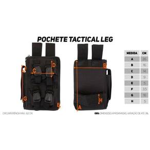 A pochete Tactical Leg é um recurso com ancoragem firme e grande capacidade de carga. Ela permite o transporte e fácil acesso a equipamentos pois está sempre junta ao corpo sem manter as mãos e braços ocupados, além disso, é possível operacionalizar ela por inteira, pois o zíper está presente em três lados.