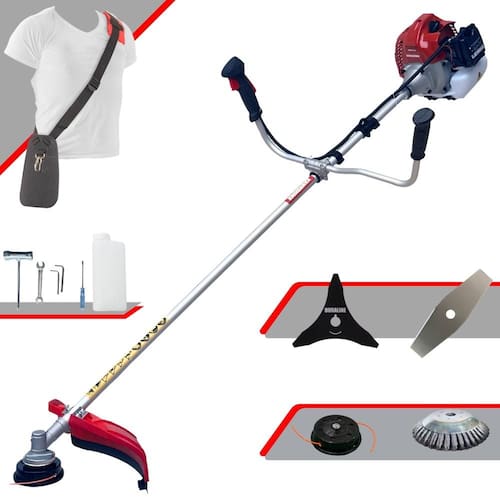 Com guidão ergonômico lateral, permite um alcance amplo e maior mobilidade, capaz de aumentar a produtividade diária. Possui motor 2 tempos á gasolina, de 43 Cilindradas; 1,7HP de potência que proporcionam maior performance e economia na operação. Seu conjunto de acessórios inclui kit de ferramentas, cinto de suporte almofadado, carretel de nylon e lâmina de corte 3 pontas.