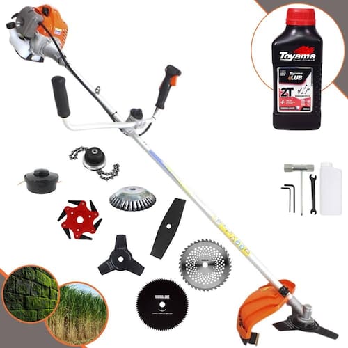 Roçadeira Lateral Vulcan VR430P À Gasolina 2 Tempos 43cc 1,7HP + Faca 2 Pontas 330mm + Faca 40 Dentes 255mm + Faca 80 Dentes 255mm + Faca 6 Pontas 250mm + Trimmer + Escova Rotativa 200mm 38 Cerdas + Óleo Toyama FG50 500ml