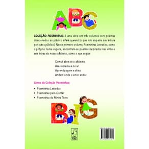 COLEÇÃO POEMINHAS é uma série em três volumes com poemas direcionados ao público infanto-juvenil (o que não impede sua leitura por outro público). Neste primeiro volume, Poeminhas Letrados, como o próprio nome sugere, encontram-se poemas inspirados nas vinte e seis letras do nosso alfabeto, como o que segue: Com A abre-se o alfabeto Asas abrem-se no ar Aprendizagem e afeto Andam onde o amor andar. Livros da Coleção Poeminhas: • Poeminhas Letrados • Poeminhas para Contar • Poeminhas da Minha Terra Marca: ALBATROZINHO EDITORA