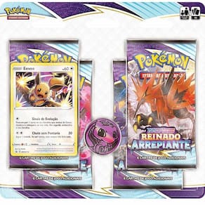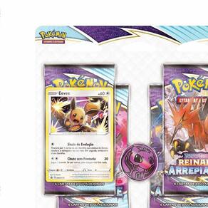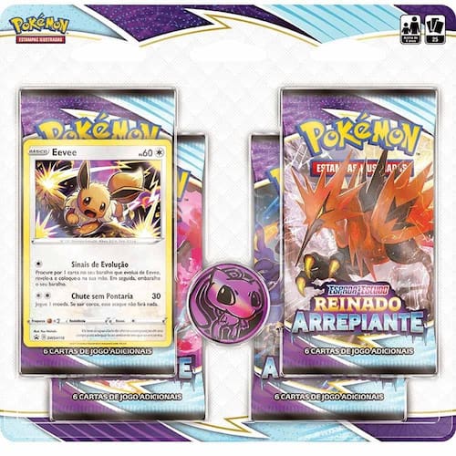 Pokémon Blister Quadruplo Reinado Arrepiante Eevee - Copag Reine sobre a tundra congelada! Aproveite todas as regalias que Pokémon de terras gélidas podem oferecer com os poderosos Calyrex Cavaleiro Glacial VMAX e Calyrex Cavaleiro Espectral VMAX, além das formas de Galar de Articuno, Zapdos e Moltres! Prepare-se para assombrações fantasmagóricas, nevascas de arrepiar e batalhas inesquecíveis, e expanda os limites das suas estratégias com novos poderes e possibilidades. Não se intimide diante de oponentes apavorantes e conquiste a vitória absoluta na terra da neve espectral com a expansão Espada e Escudo 6 Reinado Arrepiante do Pokémon Estampas Ilustradas! Idade recomendada: a partir de 4 anos de idade. Selo INMETRO: Em certificação.