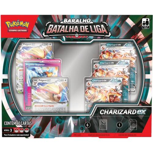 POKÉMON 3 Charizard ex, 3 Charmeleon, 4 Charmander, 2 Pidgeot ex, 2 Pidgeotto, 3 Pidgey, 3 Moltres CARTAS DE TREINADOR 4 Kissera, 2 Arven, 2 Ordem da Chefia (Ghetsis), 2 Pesquisa de Professores (Profª Arka), 2 Artazon, 4 Poffin de Colega, 4 Doce Raro, 4 Ultra Bola, 1 Pegador Superior, 1 Supervara, 1 Substituição, 2 Máquina Técnica: Evolução, 1 Faixa de Desafio CARTAS DE ENERGIA 10 Energia de fogo Básica