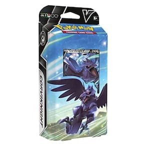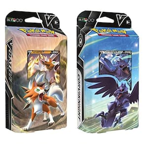Crashing Fangs and a Sky Hurricane - com Lycanroc V e Corviknight V. Libere os poderes do crepúsculo e da noite com um deck liderado por Lycanroc V ou Corviknight V. Lycanroc V lidera uma equipe esmagadora de tipos de luta, e Corviknight V traz o poder esmagador dos tipos Metal, para que você possa acertar grandes sucessos turno após turno, mantenha a Energia em jogo e domine todos os truques desses dois Decks de Batalha V.