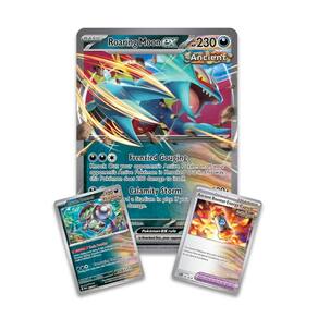 Pokémon TCG: Lua rugida/Iron Valiant ex Box - Você receberá, aleatoriamente, um Pokémon TCG: Roaring Moon ex Box ou um Pokémon TCG: Iron Valiant ex Box. - Dependendo de qual caixa você receber, você receberá 1 cartão promocional e 1 cartão de alumínio grande com a ex da Lua rugindo ou Ex Iron Valiant, juntamente com 1 cartão de alumínio grande com a ex da Lua rugindo ou Ex Iron Valiant. - Você também receberá 1 cartão de treinador com cápsula de energia de reforço antigo ou cápsula de energia Future Booster. - Isso também oferece 4 boosters Pokémon TCG e um cartão de código para Pokémon TCG Live.