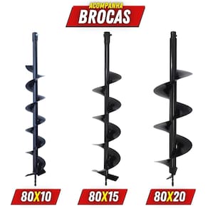 - Broca 80x20cm Com Pino Trava e Grampo - Tipo: Broca para perfurador de solo - Diâmetro da Broca: 20cm - Comprimento da Broca: 80cm - Acoplamento: o tamanho do furo pra encaixe do eixo da broca é de 2cm.