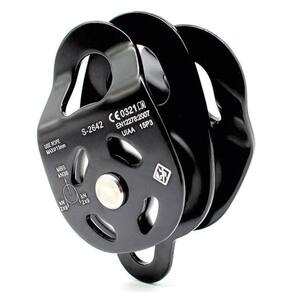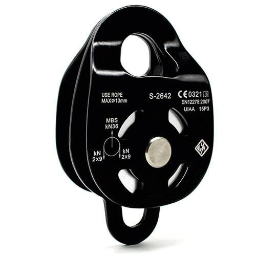 Polia dupla com placas oscilantes, para corda de até 13mm, carga de ruptura 36KN. Utilizada para diversas atividades em altura, bem como sistema de redução de peso. Placas laterais oscilantes e engates para mosquetões nos dois lados (abaixo e acima das roldanas). Polia com rolamentos internos, feito em alumínio. Sistema com placas oscilantes, com roldanas especiais.