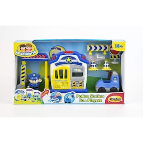 Inclui posto de polícia com porta móvel, policial, ladrão (faz de conta), cão policial, carro de policial, prisão (faz de conta), sinais e cones