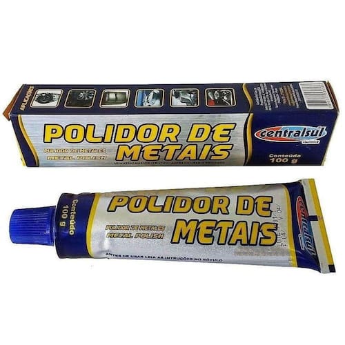 DETALHES DO polidor de metais 100g CENTRALSUL: Produto desenvolvido para recuperar o brilho de peças metálicas, deixando a superfície com uma película protetora. Remove sujeiras além de proteger a superfície contra ferrugem. Indicado para ser utilizado em superfícies metálicas como aço inox, alumínio, latão, prata, cobre, níquel, cromo. Produto pronto para o uso e fácil de ser aplicado.