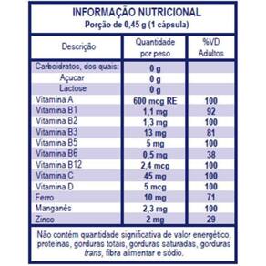 As vitaminas b1, b2, b3, b5, b6, b12, ferro e o manganês auxiliam no metabolismo energético. As vitaminas a, b6, b12, c, d, ferro e zinco auxiliam no funcionamento do sistema imune. As vitaminas b1, b2, b3, b6, b12 e o zinco auxiliam no metabolismo de proteínas, carboidratos e gorduras. As vitaminas b2, c, manganês e o zinco são antioxidantes que auxiliam na proteção dos danos causados pelos radicais livres.