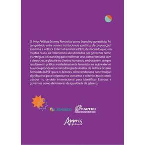 O livro Política Externa Feminista como branding governista: há congruência entre normas institucionais e práticas de cooperação? examina a Política Externa Feminista (PEF), destacando que, em muitos casos, os feminismos são utilizados por governos como estratégias de branding para reafirmar seus compromissos com a democracia global e os direitos humanos, embora nem sempre resultem em práticas verdadeiramente feministas na ação exterior. A autora propõe uma metodologia de Análise de Política Externa Feminista (APEF) para os leitores, oferecendo uma contribuição significativa para (re)pensar os conceitos e critérios tradicionais utilizados no cenário internacional para identificar Estados e governos como defensores da igualdade de gênero.