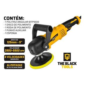 Amarelo 127V - Transforme seu projeto automotivo com um brilho que impressiona Deixe seu carro impecável e com aspecto de novo, elevando o valor e o cuidado com seu veículo. Descubra o poder de um acabamento perfeito: Potência Imbatível de 1000W: Garante desempenho superior para polir e lixar com eficiência. Disco de 5 Polegadas 125mm : Tamanho ideal para trabalhar em diversas áreas do veículo, alcançando cantos e curvas com facilidade. Ergonomia e Durabilidade: Design pensado para o conforto do operador, permitindo longas sessões de trabalho sem fadiga. Acessórios Completos: Inclui disco de polimento, roda de polimento, esponja, punho auxiliar e manual, pronto para usar. Especificações Técnicas: Marca: The Black Tools Modelo: BTP1000 Potência: 1000W Velocidades: 6 níveis variáveis, de 2800 a 5800 RPM Diâmetro do Disco: 125mm 5 polegadas : 06 Meses Itens Inclusos: 01 Politriz Angular 5 1000W BTP1000 01 Disco de Polimento 01 Roda de Polimento 01 Punho Auxiliar 01 Esponja 01 Manual de Usuário Não perca mais tempo com resultados medíocres Adquira agora sua Politriz Angular The Black Tools e eleve o padrão dos seus trabalhos de polimento e acabamento. Clique em Comprar e veja a diferença Marca: Não Informado
