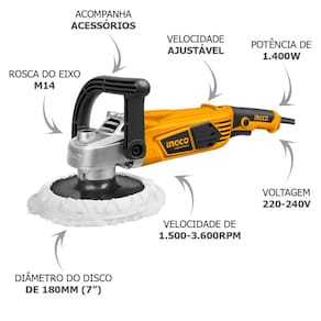 Informações Adicionais: - Marca: Ingco - Tensão: 220-240V - Código do Fabricante: AP14008-9 / AP140016-9 - EAN: 6925582140262 - Diâmetro do Disco: 180 mm (7”) - Rosca do Eixo: M14 - Velocidade sem carga: 1.500-3.600rpm