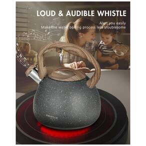 Anti Rust QUALIFIED FINISH Stylish tea kettle electroplated for longevity. Professional food grade finish and 18, 8 stainless steel craftsmanship,ensures this kettle is rust corrosion resistant. You will enjoy years of continuous use with no fading over time. Every surface exposed to the water and food particles is certified as food grade safe. LOUD AUDIBLE WHISTLE The automatic whistle is loud enough so you can hear the whistle with plenty of background noise. The whistle on this kettle will grab your attention while you are focused on other issues such as housework, movies, or games at the same time. Simple and time saving with no tensão. SIMPLE TOUCH BUTTONS WITH HEATRESISTANT HANDLESilicone coated handle allows you to grab the tea kettle with bare hand without risking burns. The ergonomic shape and design maximaze your comfort to lift, pour and fill.Simple touch button provides easy open close and makes one hand pouring possible. FAST HEAT BASE This tea kettle is designed with a generous 8 inch base that maximizes heat conduction. Our self sealing lid offers a 100 seal to increase the efficiency of boiling.High grade 18, 10 of stainless steel is suitable for any heat source including gas, electric, induction, halogen and radiant stoves. SATISFACTION GUARANTEED Poliviar is committed to providing our consumers the absolute best value and quality on our entire line of products. All of our products qualify for a full 12 month warranty. Our service team provides premium service to help solve any problem.