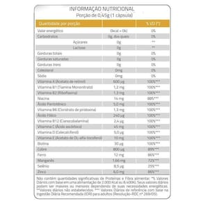 Recomenda-se ingerir 1 cápsula ao dia, que atende a Ingestão Diária Recomendada (IDR) descrita na tabela de Informação Nutricional. Deve ser ingerido com líquido.