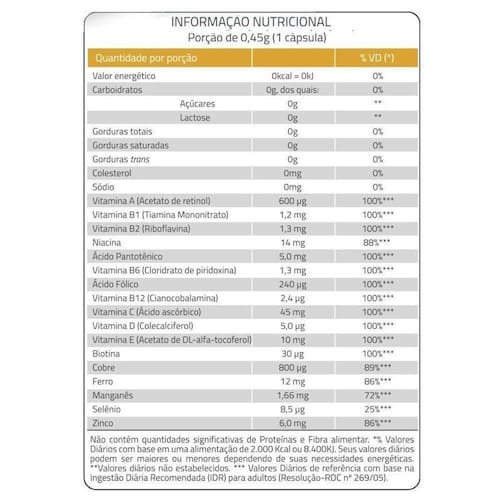 Ácido Ascórbico, Pirofosfato de ferro, Acetato dl-alfa-tocoferol, Sulfato de zinco, Nicotinamida, Pantotenato de cálcio, Sulfato de manganês, Acetato de retinol, Sulfato de cobre, Colecalciferol, Cloridrato de piridoxina, Mononitrato de tiamina, Riboflavina, Ácido Fólico, Biotina, Selenito de sódio e Cianocobalamina. Antiumectantes: Celulose Microcristalina (INS 460i) e Dióxido de silício (INS 551). Gelificante: gelatina (INS 428). Corantes: Dióxido de titânio (INS 171), Amarelo crepúsculo (INS110) e Vermelho 40 (INS 129).