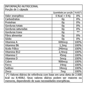 Ácido ascórbico, Fumarato ferroso, Óxido de Zinco, Acetato de Retinol, Cianocobalamina, Colecalciferol, Sulfato cúprico, Cloridrato de Piridoxina, Selenito de Sódio, Ácido Fólico. Agente de massa: Celulose Microcristalina (INS 460i), Antiumectantes: Dióxido de silício (INS 551) e Estearato de magnésio (INS 470iii), Gelificante gelatina (INS 428), e Corantes: Dióxido de titânio (INS 171), Azul Brilhante (INS 133), Amarelo de Quinoleína (INS 104) e Amarelo Crepúsculo (INS 110). NÃO CONTÉM GLÚTEN.