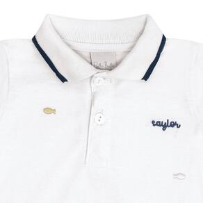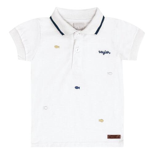 Camiseta meia malha com gola polo na cor branca, essencial para o baby poder usar em ocasiões especiais e encantar a todos com sua fofura. A peça possuí pequenos peixinhos estampados e bordado próximo do peito com escrita "sailor". *Sugestão Look Ano Novo