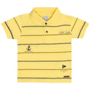 Com toque suave e fresquinho para uso diário ou ocasiões especiais, a camiseta polo na cor sol possuí mangas curtas, listras e fechamento de gola por botões, etiqueta termocolante e bordado pequeno de âncora com escrita "Escola náutica 1989, explorador do oceano, melhor marinheiro".