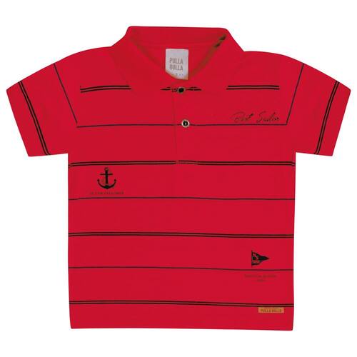 Com toque suave e fresquinho para uso diário ou ocasiões especiais, a camiseta polo na cor vermelha possuí mangas curtas, listras e fechamento de gola por botões, etiqueta termocolante e bordado pequeno de âncora com escrita "Escola náutica 1989, explorador do oceano, melhor marinheiro".