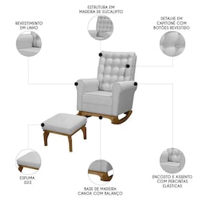 Com estrutura em madeira de eucalipto, oferece resistência e durabilidade no uso diário. A espuma D-23 combinada com o tecido linho da Poltrona proporciona um toque macio e agradável, excelente para longas períodos de amamentação. Seus pés de madeira contam com suporte estável e acabamento sofisticado, enquanto o mecanismo de balanço suaviza os movimentos, sendo perfeito para ninar o neném, promovendo relaxamento e bem-estar. O assento e o encosto são sustentados por percintas elásticas, garantindo firmeza e apoio adequados. O Puff incluso é ótimo para descansar os pés e aumentar ainda mais o conforto. Perfeita para quem busca praticidade e estilo, essa Poltrona de Amamentação se adapta facilmente a qualquer ambiente, seja no Quarto de bebê, na Sala de Estar ou em outros espaços, trazendo elegância e aconchego.
