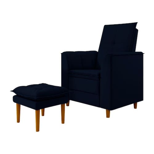 Estrutura: Em Madeira de EucaliptoEncosto da poltrona: Enchimento 100% em Fibra SiliconadaPuff: Enchimento 100% em Fibra SiliconadaAssento da poltrona: Espuma D-23Conteúdo da Embalagem:1 Poltrona e 1 Puff.Material dos Pés: Em madeiraRevestimento: SuedePeso Suportado: 110 kg
