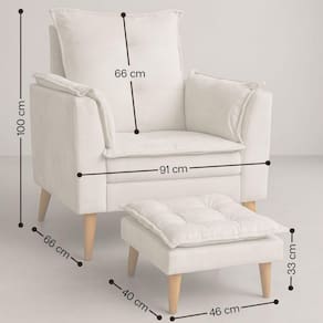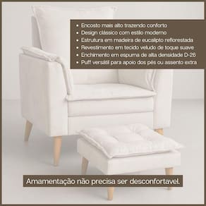 O revestimento em suede macio, a estrutura em madeira de eucalipto reflorestada e o enchimento em espuma de alta densidade garantem conforto, durabilidade e sofisticação. O puff que acompanha complementa o conjunto, servindo como apoio para os pés ou assento extra.