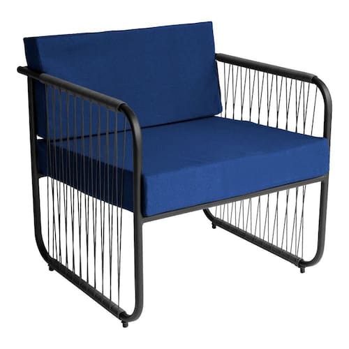 Poltrona área Externa Córdova Aço Carbono E Fibra Sintética Preto/azul A Poltronas Cordova e a escolha ideal para quem busca conforto, durabilidade e elegancia em ambientes diversos. Com estrutura em aco carbono e acabamento em fibra sintetica. Seu encosto e assento estofado com tecido impermeavel proporciona conforto e praticidade, tornando o uso ainda mais agradavel. Produzidas de forma artesanal, combinam sofisticacao e exclusividade no design. Ideais para areas gourmet, areas, sala de estar, churrasqueira, recepcao, ediculas e outros espacos que exigem um toque especial de charme e aconchego. Caracteristicas do Produto: Material: aco carbono Material do Assento: Tecido Impermeavel Material do Encosto: Tecido Impermeavel Acabamento: Fibra Sintetica Tipo de Assento: Fixo Tipo de Encosto: Fixo Possui Apoio de Braco? Sim Peso suportado(kg): 150kg