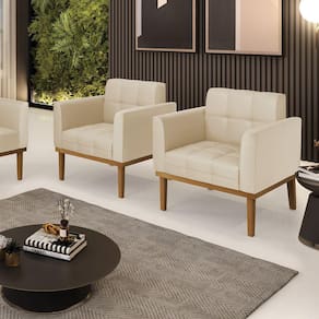 Você gosta de colecionar vários momentos memoráveis com sua família e amigos? Que tal recebê-los, com móveis de altíssima qualidade que só a D'Rossi tem? A Poltrona Elisa é adequada para você! Seu design retrô é a grande tendência do momento. Pode ser usada em diversos espaços da casa, em salas, hall de entrada, quartos, cozinhas, varanda, sacada, escritório, dentre outros. Contém as seguintes características: A estrutura é feita de madeira de Eucalipto 100% de reflorestamento, e a Base de Madeira Fixa Castanho, além de ser resistente e durável, suporta em média até 120 kg. Assento, encosto e braços, contém enchimento de espuma D-23 e é estofada em tecido Corino, no tom Bege, que oferece muito conforto e resistência ao sentar, com aquela sensação de maciez e aconchego. Possui também, detalhes de costura no encosto e assento, resultando em um acabamento impecável, conferindo muito mais valor e elegância ao seu espaço. Para complementar a decoração com essa linda poltrona, a dica é utilizar mantas, almofadas ou vasinho de flor. E pronto, seu cantinho estará perfeito para descansar e relaxar! Aqui, você encontra várias opções, para que seus amigos e familiares se sintam acolhidos. Garanta já seu Kit 2 Poltronas..