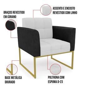 Você gosta de colecionar vários momentos memoráveis com sua família e amigos? Que tal recebê-los, com móveis de altíssima qualidade que só a D'Rossi tem? A Poltrona Elisa é adequada para você! Seu design retrô é a grande tendência do momento. Pode ser usada em diversos espaços da casa, em salas, hall de entrada, quartos, cozinhas, varanda, sacada, escritório, dentre outros. Contém as seguintes características: A estrutura é feita de madeira de Eucalipto 100% de reflorestamento, e a Base Industrial Dourado, além de ser resistente e durável, suporta em média até 120 kg. Assento, encosto e braços, contém enchimento de espuma D-23 e é estofada em tecido Corano Preto com Linho, no tom Cinza, que oferece muito conforto e resistência ao sentar, com aquela sensação de maciez e aconchego. Possui também, detalhes de costura no encosto e assento, resultando em um acabamento impecável, conferindo muito mais valor e elegância ao seu espaço. Para complementar a decoração com essa linda poltrona, a dica é utilizar mantas, almofadas ou vasinho de flor. E pronto, seu cantinho estará perfeito para descansar e relaxar! Aqui, você encontra várias opções, para que seus amigos e familiares se sintam acolhidos. Garanta já sua Poltrona.