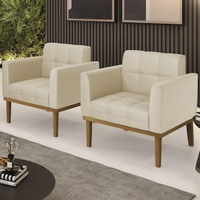 A Poltrona Decorativa é revestida em sintético, que é durável e fácil de limpar, e ainda valoriza o design da poltrona. Os braços e encosto são confortáveis em espuma D-18, já o assento é com espuma D-26 de alta densidade, que garante um assento firme e aconchegante, ideal para relaxar após um dia cansativo. A base em madeira de eucalipto é um charme à parte, que confere um toque Rústico e sofisticado à peça. São 2 poltronas com estrutura resistente que suporta até 120 kg cada. A montagem é muito simples, pois a poltrona já vem pronta, bastando apenas fixar a base com os parafusos que acompanham o produto. A limpeza também é muito prática, pois basta utilizar um pano limpo e levemente úmido, sem produtos abrasivos, para manter a sua poltrona sempre em bom estado. Sem dúvidas a Poltrona Para Sala vai transformar seu ambiente, deixando mais confortável e estiloso!